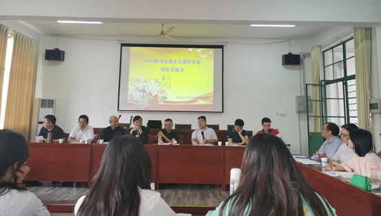 师生见面会首先是自我介绍。2020级23位研究生依次做了自我介绍,同学们对个人的兴趣爱好以及未来研究生生活的规划和目标,纷纷发表了各自的想法和志向。其次是硕士生导师代表发言。各位导师都对员工的生活、学习和论文写作等方面提出了自己的建议和期望,强调在学习中找到自己的兴趣和研究方向,建立学科自信。例如曹大文教授希望同学们学会交流,努力奋斗,多把精力放在学术研究上面,学会坚持。陈选华教授提出“净,思,勤”三字寄语,希望同学们自觉抵制网络诱惑,专注学术。
