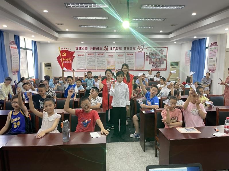 宣讲团成员唐美荣为孩子们带来了一堂生动有趣的手工课。她将事先备好的卡纸分发给孩子们和家长,并耐心地示范制作手工战斗机的方法,讲解折纸技巧。孩子们边听边学,一会儿专注于自己制作的折纸作品,一会儿向身旁的宣讲员讨教折纸的方法,纷纷沉浸在手工折纸的世界中。一张张卡纸在孩子们手中通过折、叠、翻等手法变成了一个个栩栩如生的战斗机。大家争先恐后地向宣讲员展示着自己的作品,现场一片欢声笑语。