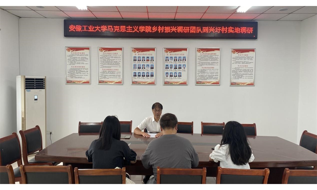 随后,实践队队员来到兴圩村。位于马鞍山和县西南部的兴圩村,三面环河,南有太阳河,北有得胜河,西有八字河,地理位置优越,自然环境优美。在兴圩村驻村书记郭道江的带领下,实践队来到兴圩村黑木耳种植基地、藕塘种植基地、芦笋种植基地等村集体产业项目现场。郭道江向大家详细介绍了兴圩村产业发展从无到有的历程、产业在发展过程中遇到的困难及克服方法、产业发展取得的成效。通过产业基地的参观,队员们深刻地感受到产业振兴是从“输血”到“造血”功能推进的新动力,不仅能带来更多的收入和就业,也为振兴乡村注入了新的活力。在参观产业基地后,团队成员分别对百峰村的书记齐道江、团委刘文进行了采访。在采访的过程中,团队了解到乡村振兴工作离不开党和国家的指导、离不开党组织作用的发挥、离不开村委干部带头作用的发挥,组织振兴是乡村振兴的“第一工程”,是构建现代化乡村体系的基石。新时代青年要自觉用习近平新时代中国特色社会主义思想武装头脑,为实现乡村组织振兴注入澎湃动能。