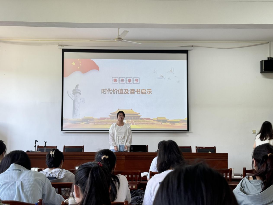第三小组的刘燕、李梦真同学分享的篇目是《实践论》,从撰写初衷、理论解读、研究现状、自我感悟等层面展开读书汇报。该小组同学从唯物辩证法的角度重点解读了实践与认识相互转化的过程以及认识与实践的规律,并从思想政治教育切入,指出思想政治教育要解决好如何教会员工用马克思主义认识论去指导实践的问题,号召研究生们要关注现实、知行合一。