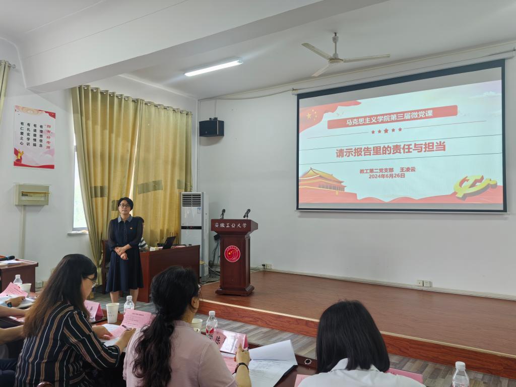 冀秀芝在点评中指出,本次微党课比赛内容丰富、形式多样,通过情景剧、诗歌朗诵、视频播放、现场讲述等表现形式,比赛讲述有理论、有故事、有激情,内容鲜活,脉络清晰,史实结合,情理交融,声情并茂,引发了现场听众的强烈共鸣和深入思考,充分展示了马院风采。