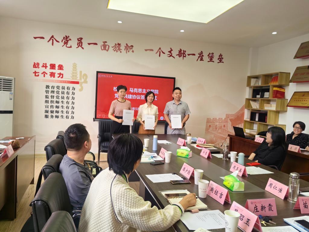 签约仪式上,毛泽东思想和中国特色社会主义理论体系概论教研室党支部、习近平新时代中国特色社会主义思想概论教研室党支部与校团委党支部签订了党建共建协议。
