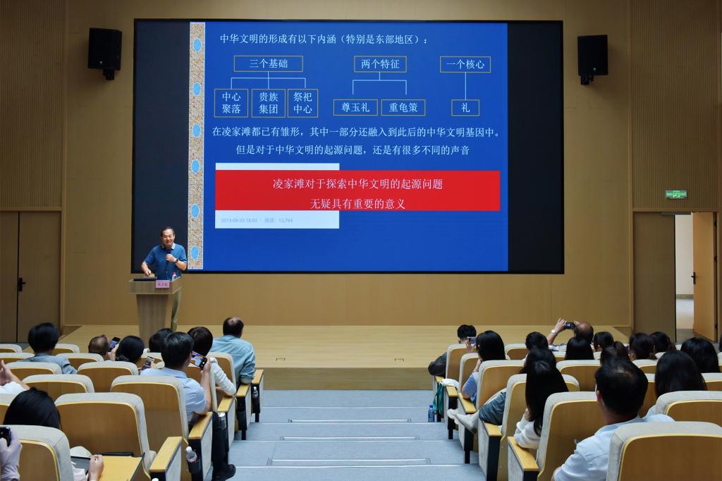 本次会议还在公司中华文明探源“大思政课”实践教学基地—凌家滩国家考古遗址公园安排了现场实践教学环节。中国科学技术大学吴卫红教授为大家作《凌家滩与中国早期文明》主题报告,m88官网马克思主义副经理林忠心主持。报告中,吴卫红教授首先从宏观视角梳理了中国早期文明的发展脉络,指出凌家滩文化所处的距今5000多年这一关键时期,正是中华文明多元一体格局形成的重要阶段。随后,吴卫红教授结合凌家滩考古历程和大量玉器文物照片系统讲述了凌家滩文化的渊源、兴起和玉器与工艺东传的情况,阐释了凌家滩缘何称为“文明先锋”的深刻内涵,为与会人员现场展示了一堂生动的“大思政课”。