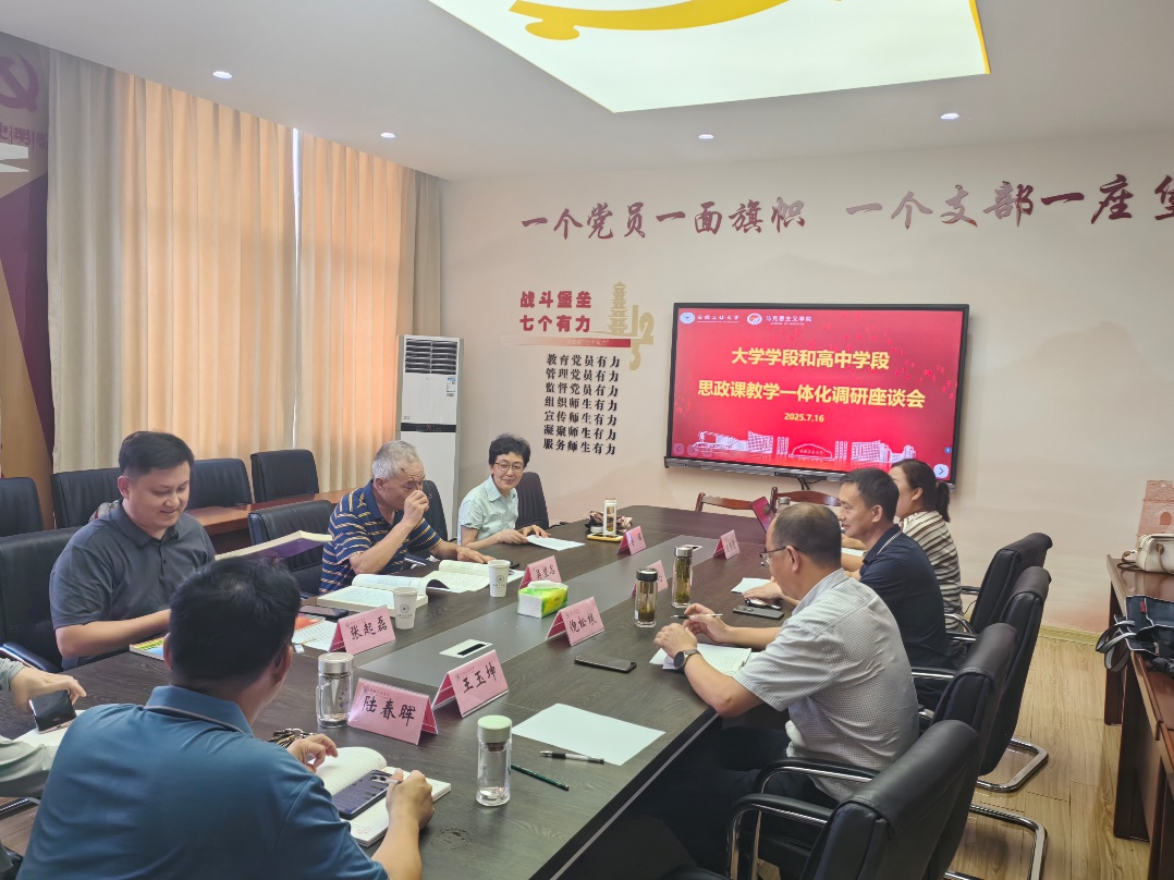 调研座谈会围绕高中学段和大学学段思政课的课程标准、教学目标、教学重点、考核细则、教学设计、教学方法等方面展开。会议重点就高校思政课程《中国近现代史纲要》与高中政治必修教材教学重点内容相互对照和有效衔接进行了分析和探讨;从认知水平、知识掌握情况、思维方式和社会生活经验等展开了高中学段和大学学段的学情分析;从教学设计和教案撰写等方面探讨了思政课教学创新。座谈会持续了近3个小时,问题聚焦、交流充分,气氛热烈,达到了预期效果。
