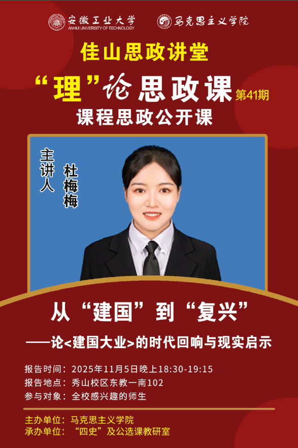 为全力构建“大思政”格局,推进 “人人讲育人、门门有思政”的全员全程全方位育人,落实“课程思政”公开示范课教学展示活动要求,现开展 “‘理’论思政课”(第 41期)课程思政公开课。具体安排如下: